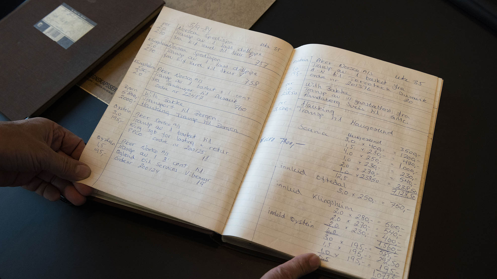 Internett: sr-group.noFra en av hyllene på kontoret finner Røstad frem en notatbok. En litt slitt bok med blått cover rundt A4-størrelse og inni fylt med håndskrevne notater og regnestykker fra de første driftsårene, som viser hva som ble fraktet hvor og til hvilken pris.
