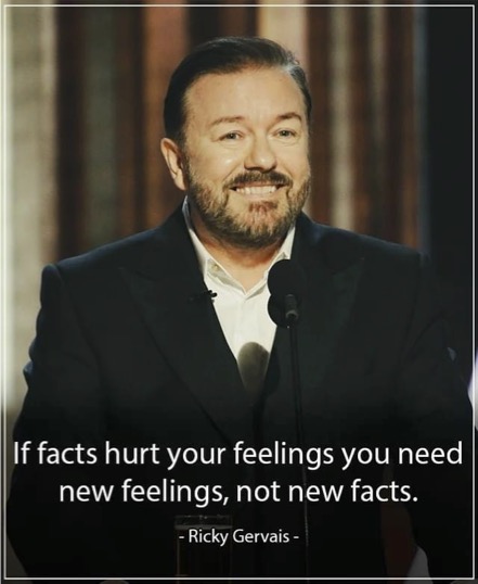 Ricky Gervais er mest kjent for rollen i komiserien Kontoret! Skuespiller, komiker, forfatter og regissør. I sine show dundrer han løs på polarisering, klimafornektelse, fake news og mye annet. Sitatet over er bare et av mange gode eksempler i en tid hvor fakta kontinuerlig utfordres og forvrenges i et stadig mer skyttergravpreget og følelsesladet debattklima.