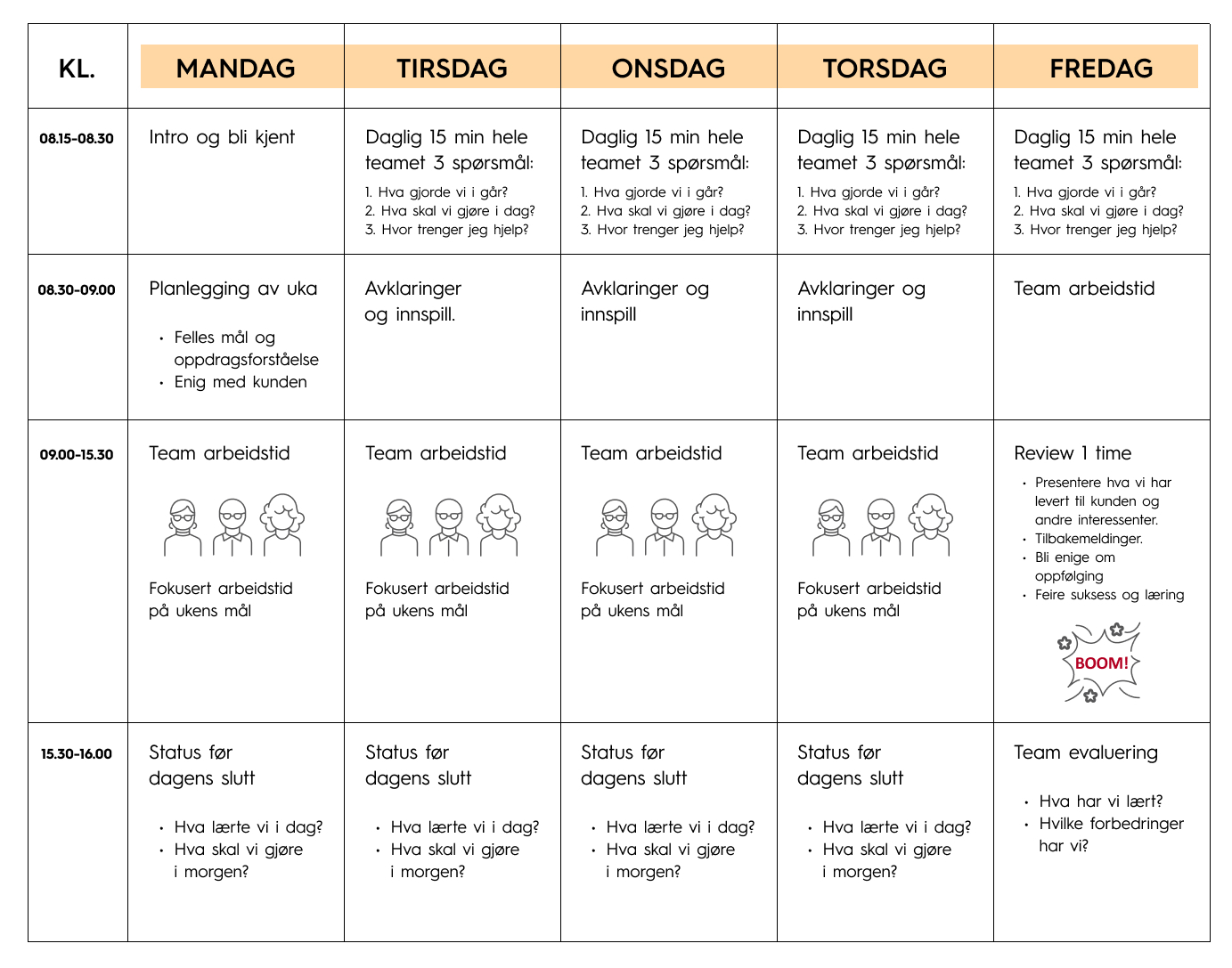 Dersom det er vanskelig å prioritere hele dager til dette arbeidet pga. andre forpliktelser, finn en løsning som funker for teamet – For eksempel, alle deltar hver dag fra kl. 10-14, alle deltar 3 av 5 dager i en uke, eller hver dag fra lunsj og utover?