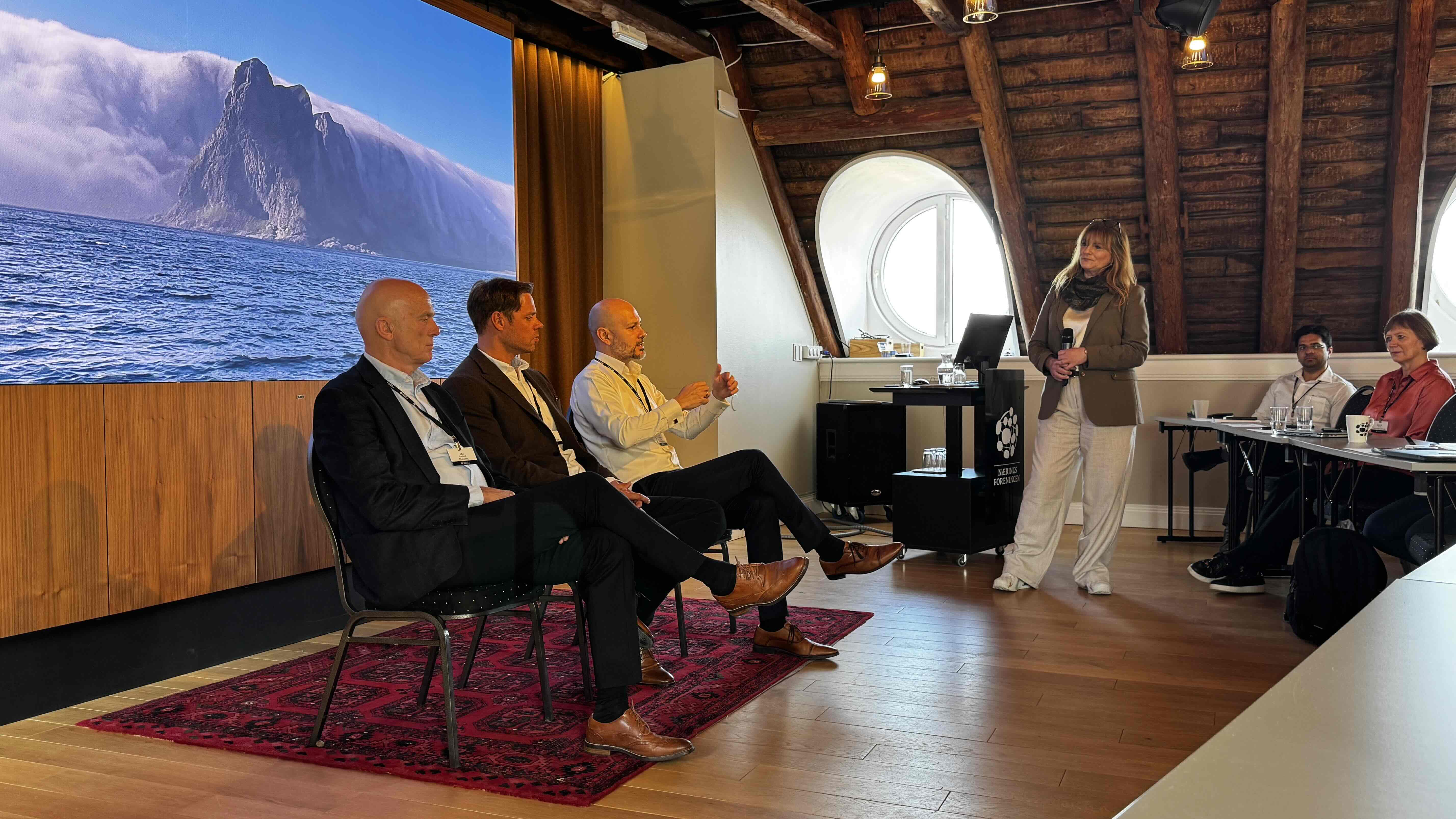 Paneldebatt med Ole Rugland (Skanem), Caspar Fabini og Cristian Valdes Carter fra Innovasjon Norge i samtale med ordstyrer Randi Mannsåker, leder Internasjonal i Næringsforeningen.