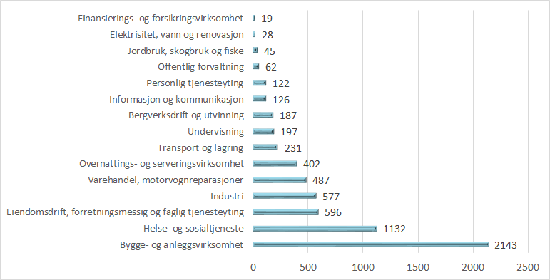 Fordelt på næringer, så er behovet for flere medarbeidere størst innen bygg- og anleggsvirksomhet med over 2100 personer. I denne næringsgruppen melder 31 prosent om at de ikke har fått ansatt noen, eller har måttet ansette medarbeidere med lavere eller annen formell kompetanse enn ønsket i løpet av de siste tre månedene.