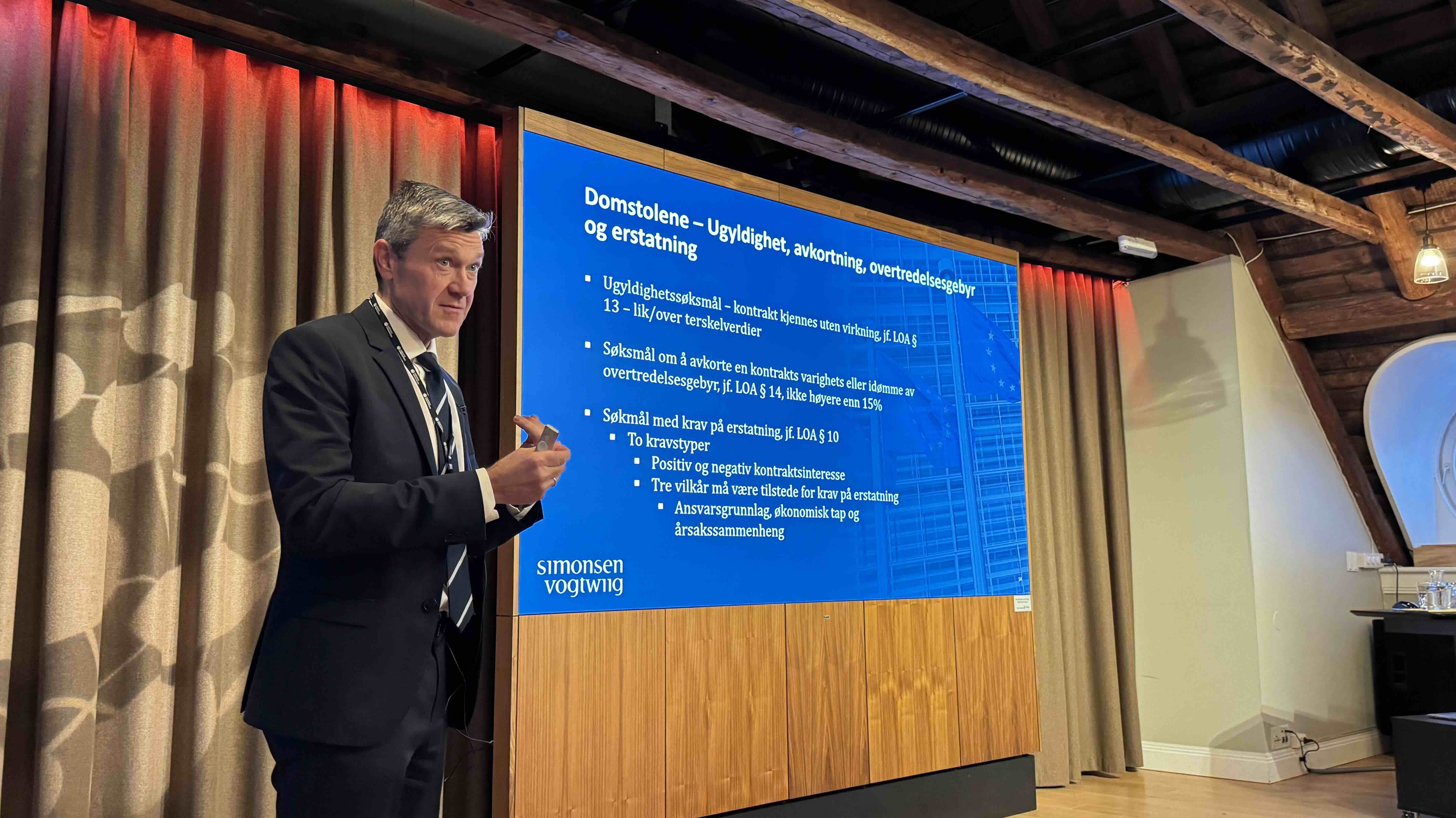 Arne Oftedal, parter i Simonsen Vogt Wiig, holder foredrag om hva man kan gjøre dersom man ikke vinner og føler seg dårlig behandlet. Hvordan man klager, når man skal klage og når man ikke skal klage. Oftedal minnet om klagefristen på ti dager etter at tildelingen har skjedd.