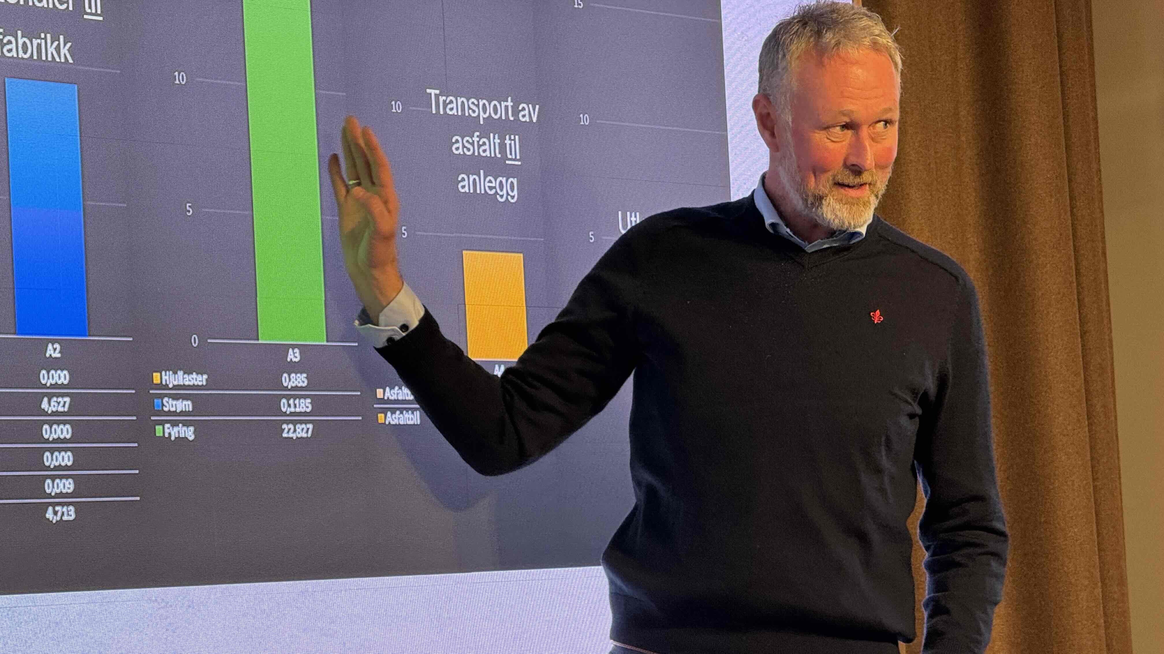 Egil Velde fra selskapet Velde holdt foredrag om hvordan Velde har investert i klimavennlige løsninger. Og hvordan blant annet bedriften gjenbruker asfalt.