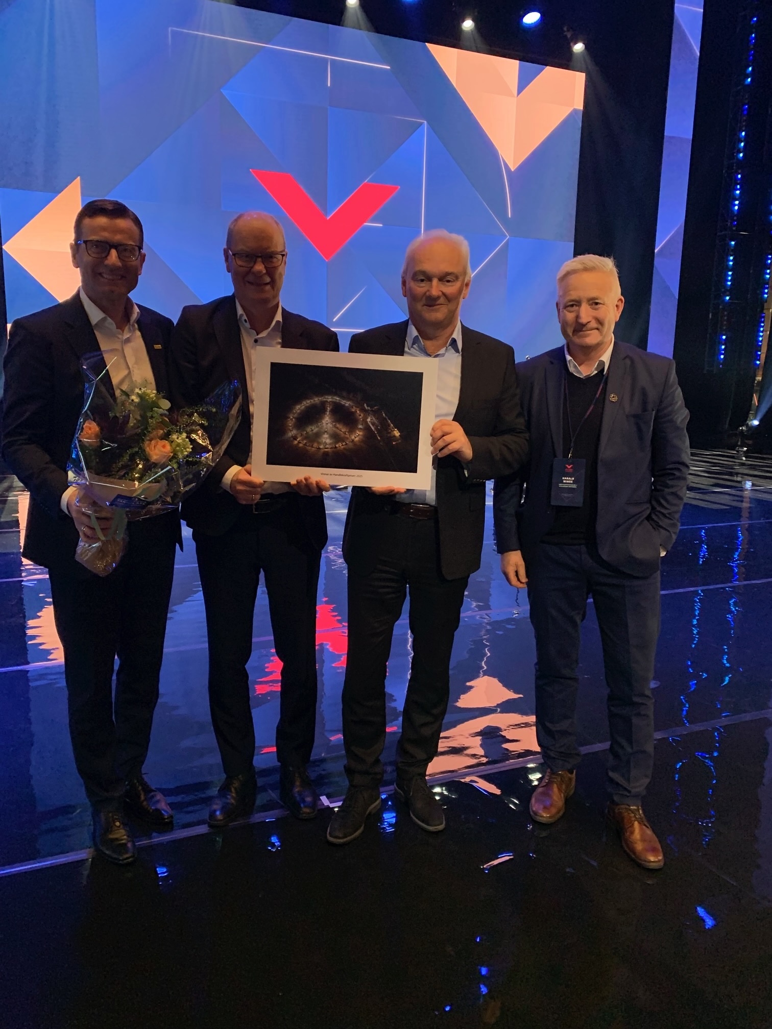 Dag Kroslid, Johannes Rasmussen, Tore Rasmussen og Harald Minge, administrerende direktør i Næringsforeningen i Stavanger-regionen, som nominerte NorDan. Foto: Næringsforeningen