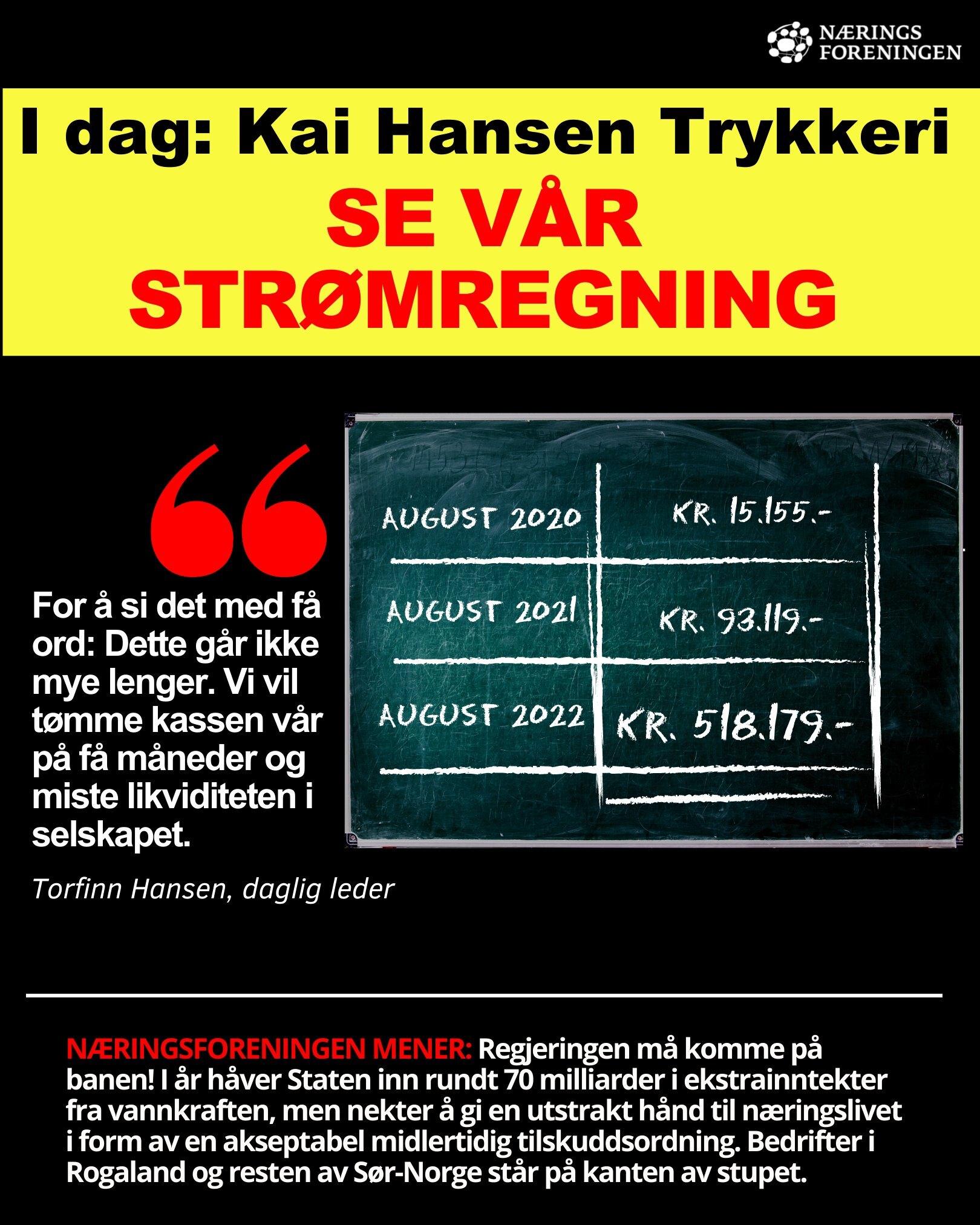 Fredag 16. september presenterte regjeringen sin «hjelpepakke» til næringslivet. NHO var med i forhandlingene og klarte å redde i land en tilskuddsordning. Problemet er at rammen er altfor lav. Ta en bedrift som Kverneland Group. På grunn av strømprisene har de ekstrakostnader på 80 millioner kroner i år. Dersom de får maks utbytte av regjeringens støtteordning, får de et tilskudd på fattige 3.5 millioner.