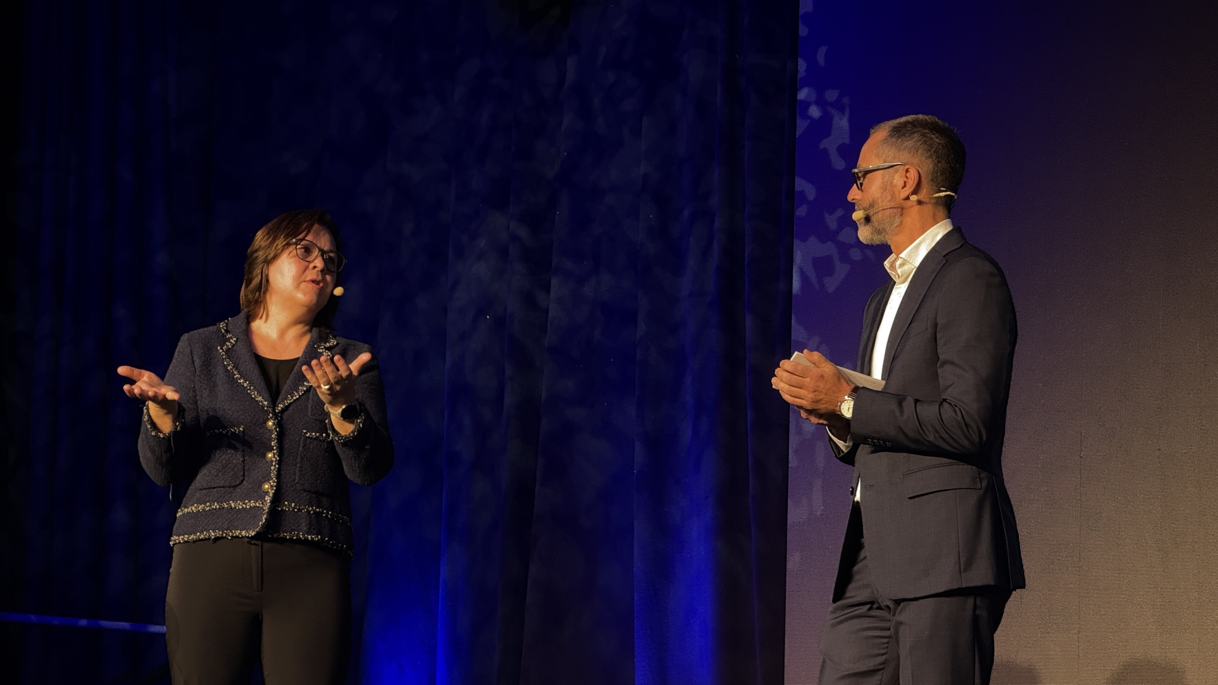 Sjeføkonom Elisabeth Holvik og moderator Johan Helgø i diskusjon.