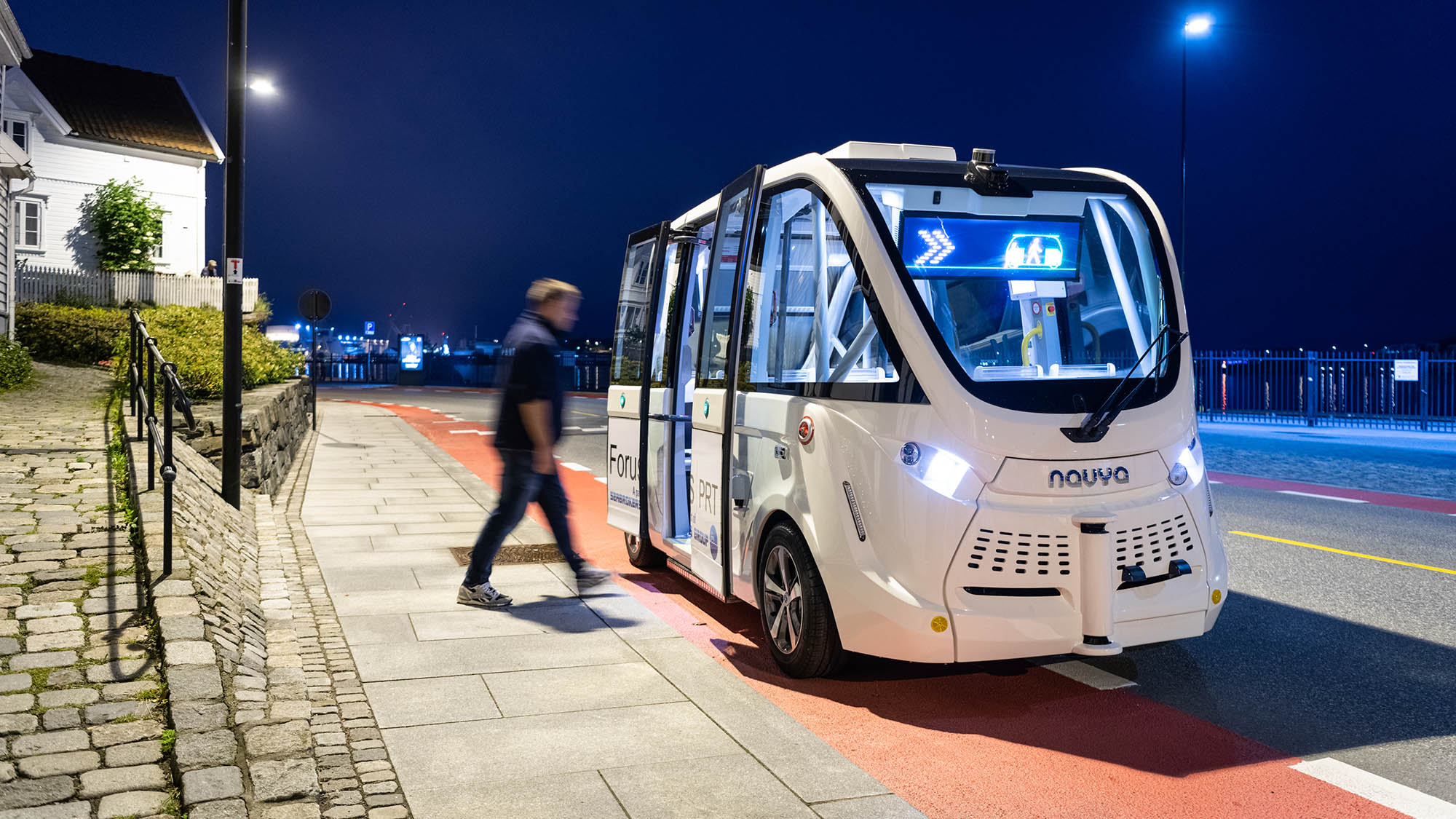 Klokken nærmer seg halv ett på natten. Mens mange sentrumsgjester har begynt å tenke på hjemturen, beveger en selvkjørende buss seg langs kaiområdet i Vågen med kurs for Bjergsted.