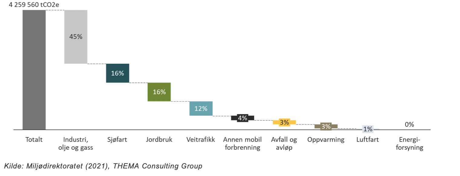 Størstedelen av utslippene i fylket kommer er i kvotepliktig sektor. Industri, olje og gass og den nest største er sjøfart og jordbruk. Skjermdump: Klimarapport Rogaland 2017-2019 og utvikling til 2030