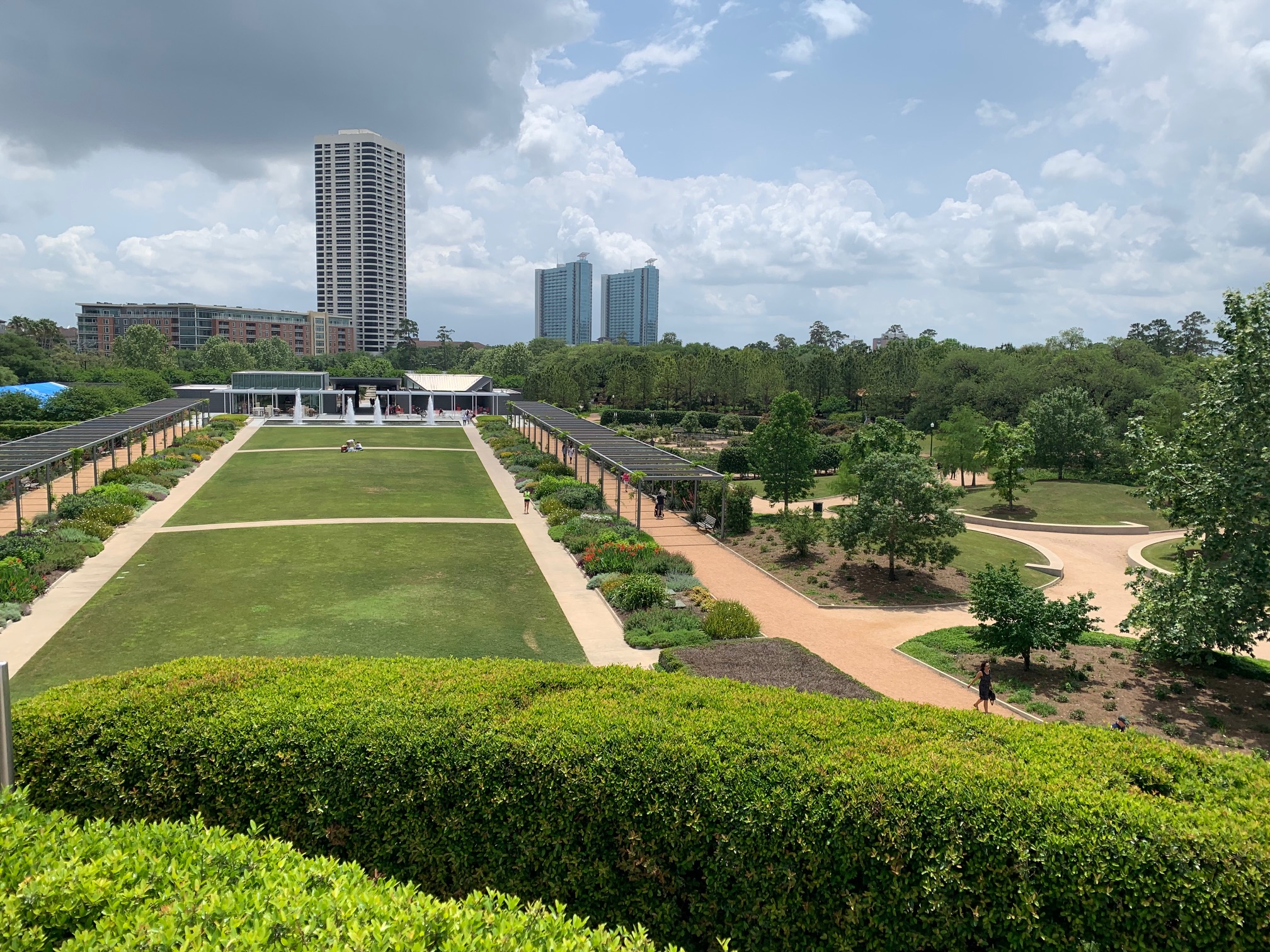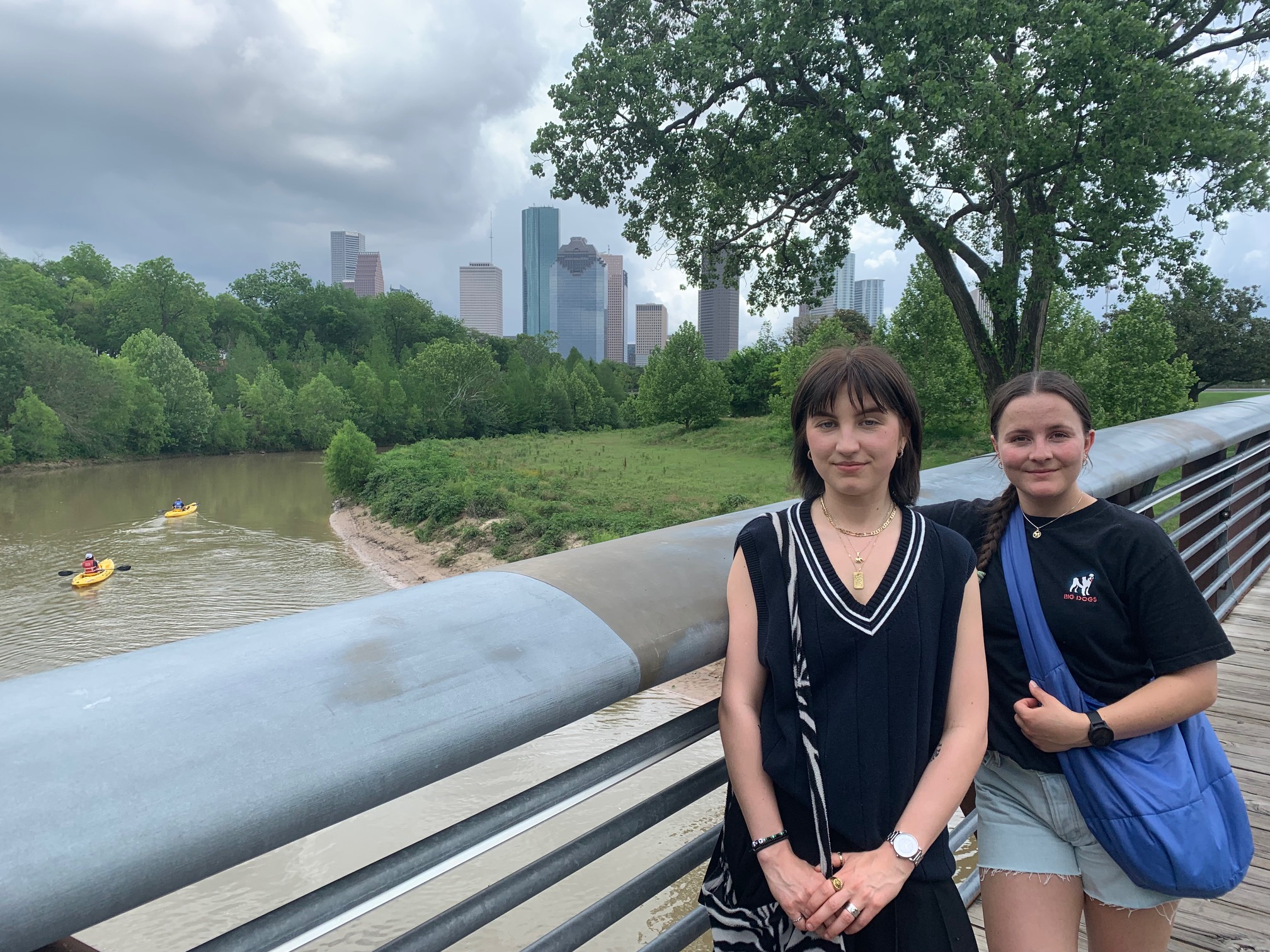 Downtown Houston: Blikjenttur med mediateamet til Innovasjon Norge, Fredrikke Schrøder og Mariell Pettersen. 29 grader varmt og regn.