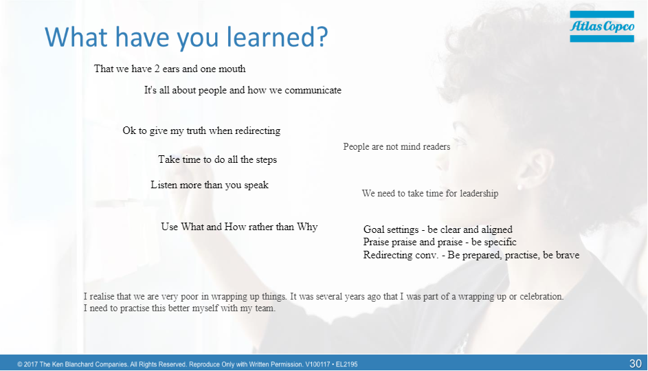 Vi i Blanchard er svært opptatt av læring og tar derfor i bruk helt andre virkemidler enn det som er vanlig i vår kunnskapsformidling. Det er spesielt viktig ved virtuelle kurs, som Blanchard også har forsket på. Begreper som digital fatigue og det å gi etter for distraksjoner bør være kjent for de fleste som har sitte på teams-møter de siste 1,5 årene, og da trengs klare regler og engasjerende verktøy. Atlas Copco har også i sin avtale at noen av kursene kan leveres fysisk, da ved Blanchards kontor i Oslo eller utenfor Stockholm, men foreløpig er man så fornøyd med den virtuelle varianten at man holder seg til den. Det er også av hensyn til fotavrtykk og miljø (unngå reising), fleksiibilitet for de ansatte (som slipper og forlate familiene sine) og tilhørende kostnader.