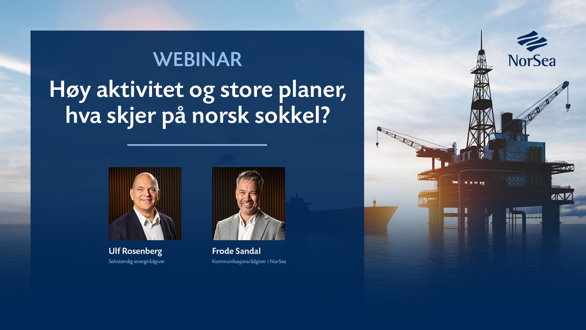 NorSea ønsker velkommen til sitt første webinar hvor vert Frode Sandal, kommunikasjonsrådgiver hos NorSea, inviterer til diskusjon rundt hva som skjer på norsk sokkel sammen med Ulf Rosenberg, energirådgiver med mer enn 25 års erfaring innen olje-, gass og energifeltet.