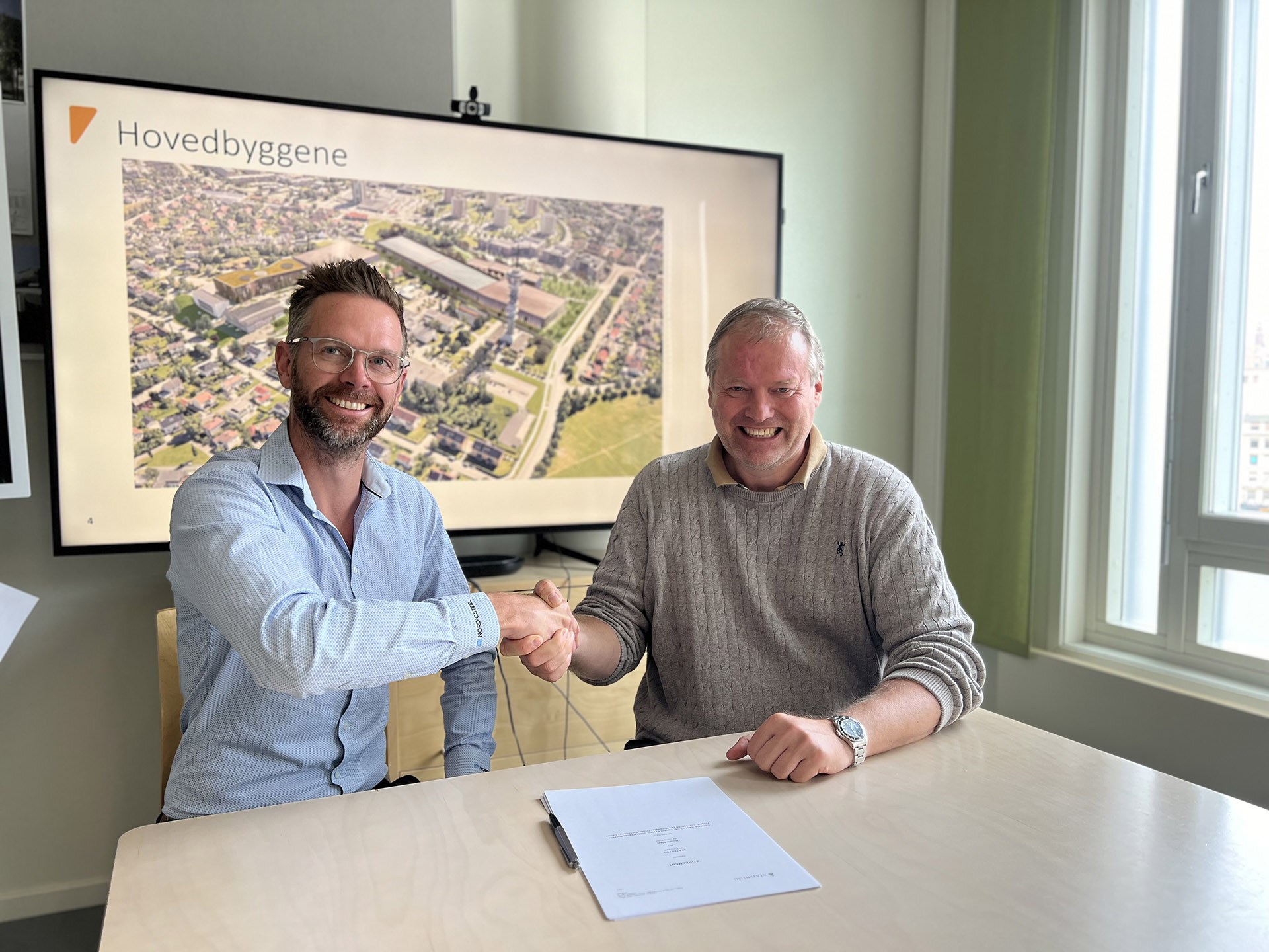 (På bildet: Torjus Ulsaker (avdelingsleder bygg Nordic Steel) og Roland Ofstad (kontraktsleder i Statsbygg)